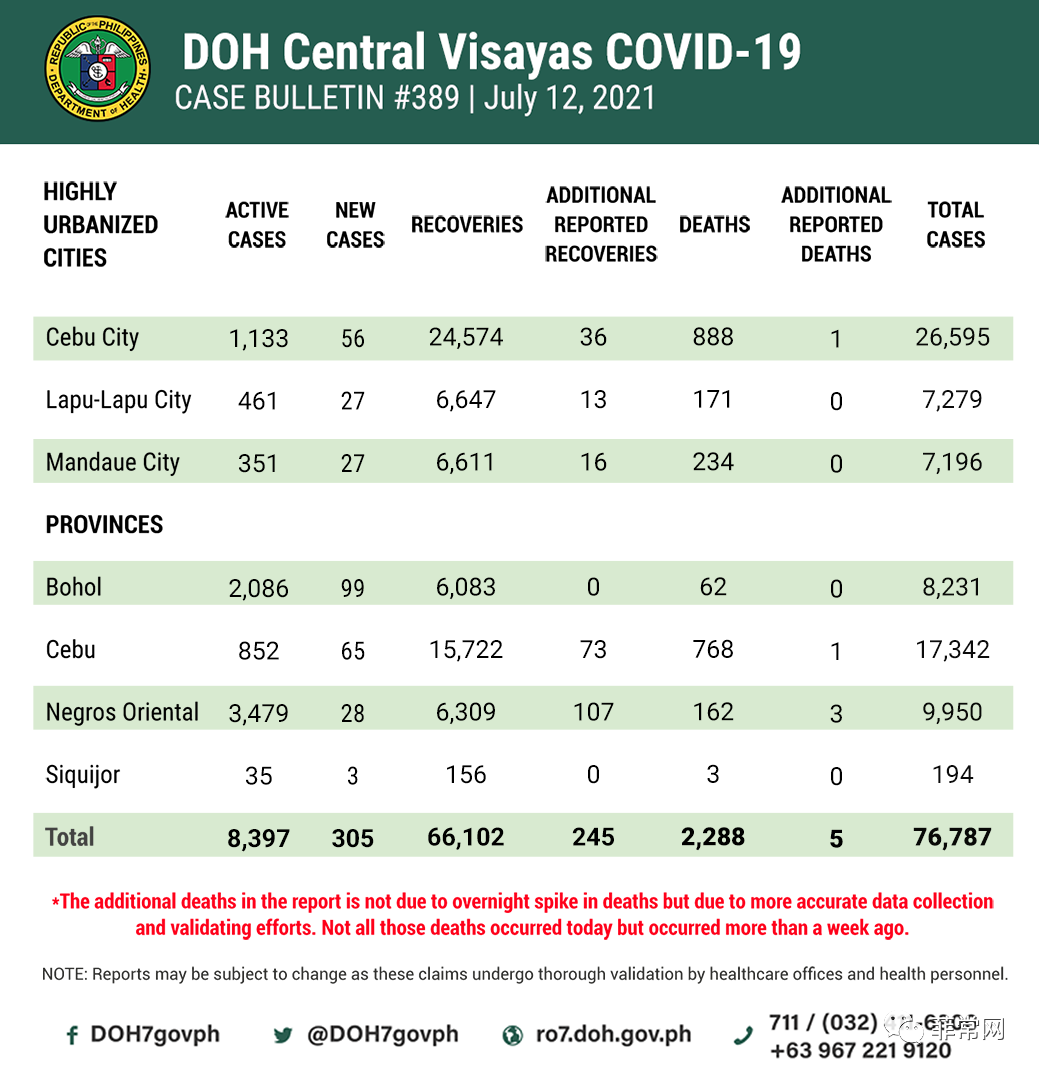 ![]() 【菲华吧7月13日专讯】菲律宾卫生部(DOH)今天下午4点宣布,报告了3,604例新的COVID-19病例,菲律宾的累计感染总数达到了1,481,660例。 ![]() ![]() 卫生部对5,840名康复患者进行了记录,总计1,481,660名康复者。 卫生部还对另77例与COVID相关的死亡,累计26,092例死亡。 根据卫生部门的数据,截至当日菲律宾现有46,934活跃病例在各种卫生设施隔离措施中接受治疗的患者。占该国已确诊病例的3.2%。 ------------------------------- 菲律宾总统府周一(12号)表示,菲律宾迄今已购买了约8900万剂新冠肺炎疫苗,价值约十亿美元,其中四亿美元已支付。 菲总统发言人哈里·罗克(Harry Roque)援引财政部的数据称,四亿美元的资金来自国家预算和多边金融机构的贷款。总统发言人未详细说明细目。 他表示:“政府与不同的疫苗制造商签订了各种合同。到目前为止,我们已采购了8900万剂新冠疫苗,费用约为十亿美元。目前,政府已经从国家预算和多边金融机构支出了四亿美元。” 根据国家抗疫工作队(NTF)的数据,菲律宾已经收到了大约2060万剂新冠肺炎疫苗。在运抵的疫苗中,有超过1040万剂是政府采购的,700万剂是来自COVAX设施,200多万剂来自双边捐赠,其余则是由各地方政府单位和私营部门采购的。 菲律宾目前已经注射至少1300万剂新冠肺炎疫苗,其中已有350万人已经完成两剂疫苗接种。 ![]() 截止时间7月13日中午12:00NN,马尼拉市卫生局(MHD)通报,当天,马尼拉市新增89例“新型冠状病毒”肺炎COVID-19确诊病例,增死亡1例,84例治愈病例。截至目前,马尼拉市累计67,070例确诊,其中死亡1,230例,目前在医院或家庭隔离措施中接受治疗的患者1,140例,康复64,700例。 华人区泯伦洛(Binondo)当日新增1例“新型冠状病毒”肺炎COVID-19确诊病例,增加死亡0例,4例治愈病例。截至目前,华人区泯伦洛(Binondo)累计1,687确诊,其中死亡22例,目前在医院或家庭隔离措施中接受治疗的患者22例,康复1,643例。 ![]() ![]() ![]() 截止时间7月12日下午17:00PM,宿务市卫生部(CHD)通报,当日宿务市新增56例“新型冠状病毒”肺炎COVID-19确诊病例. 死亡新增1例。与此同时,有36人康复。宿务市累计有26,595例确诊,其中死亡888例,目前在医院或家庭隔离措施中接受治疗的患者1,133例,康复24,574例。中米沙鄢新增305例确诊,现累计76,787例确诊。 ![]() 关注菲华吧,每天了解菲律宾多一些! 每天脑筋急转弯/谜语《449》1.谜面:陇西行留个影 (打一字) 2.谜面:西湖月初吐 (打一字) 关注菲华吧,进入公众号回复:449,揭晓答案。 |